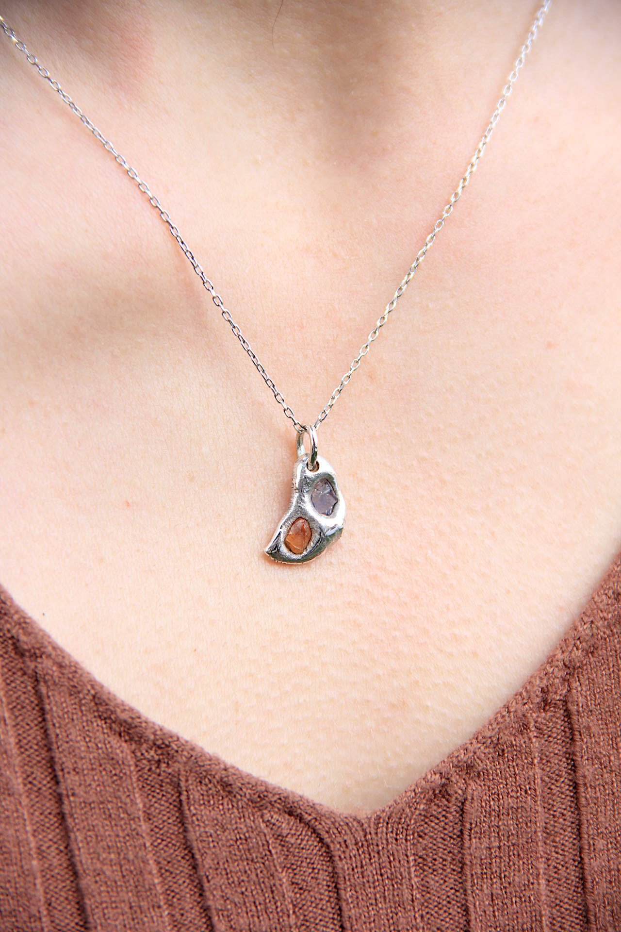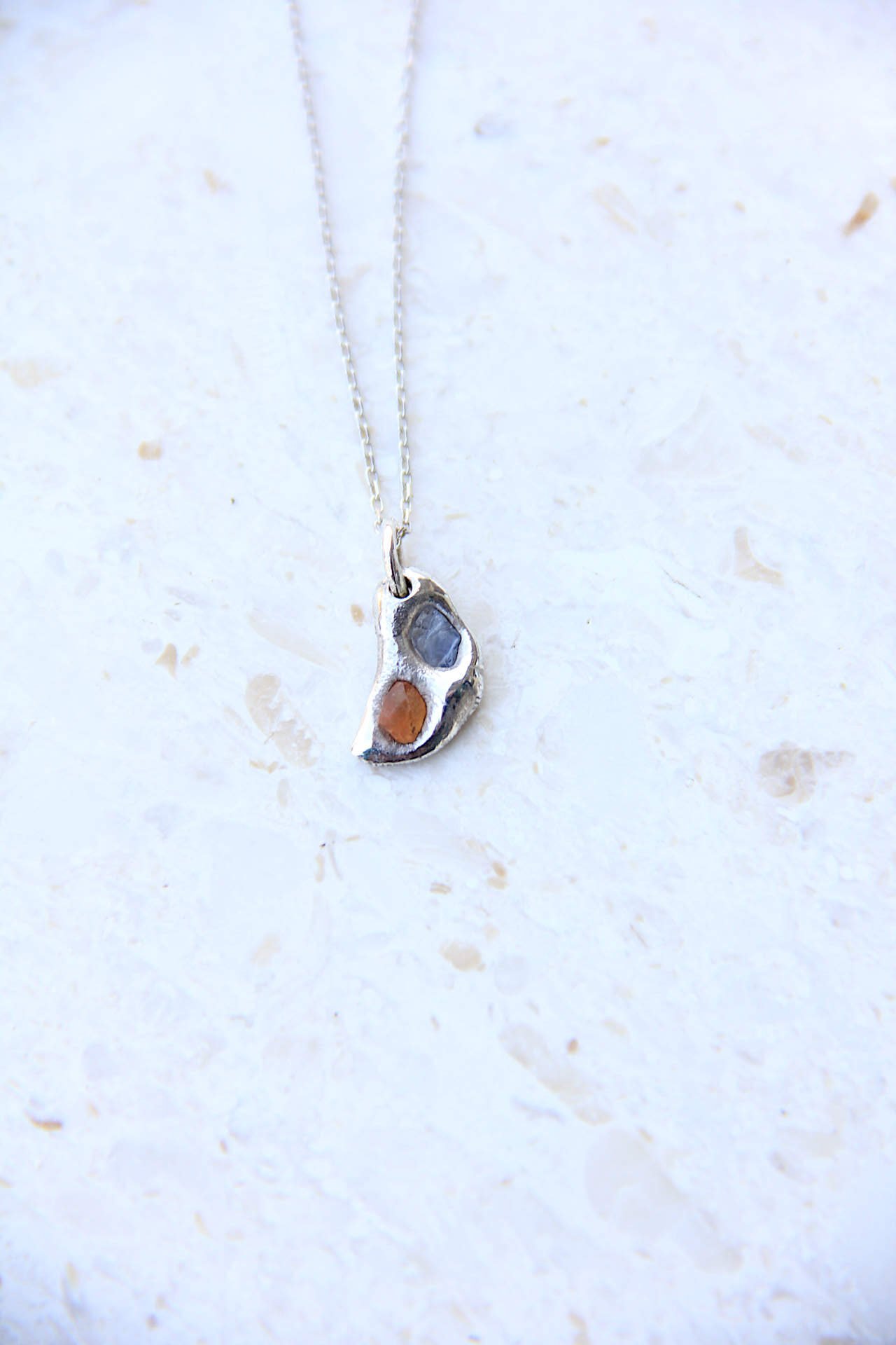 Mala elegantna ogrlica izrađena od srebra 925 sa sirovim/raw narančastim i plavim safirom ljevanjem metala na kamen, na srebrnom lančiću.