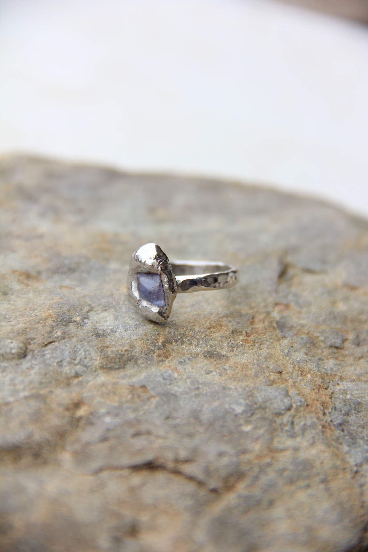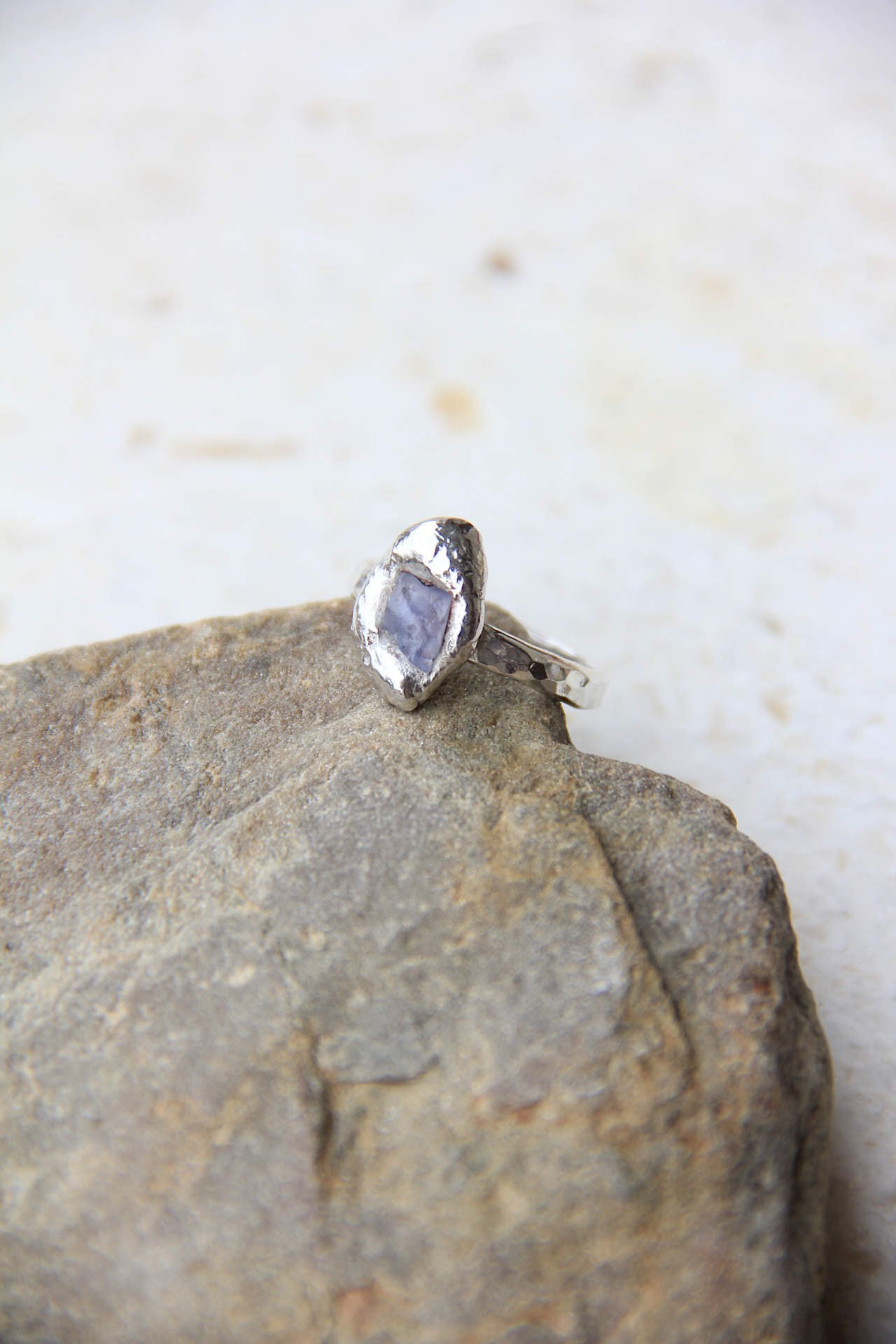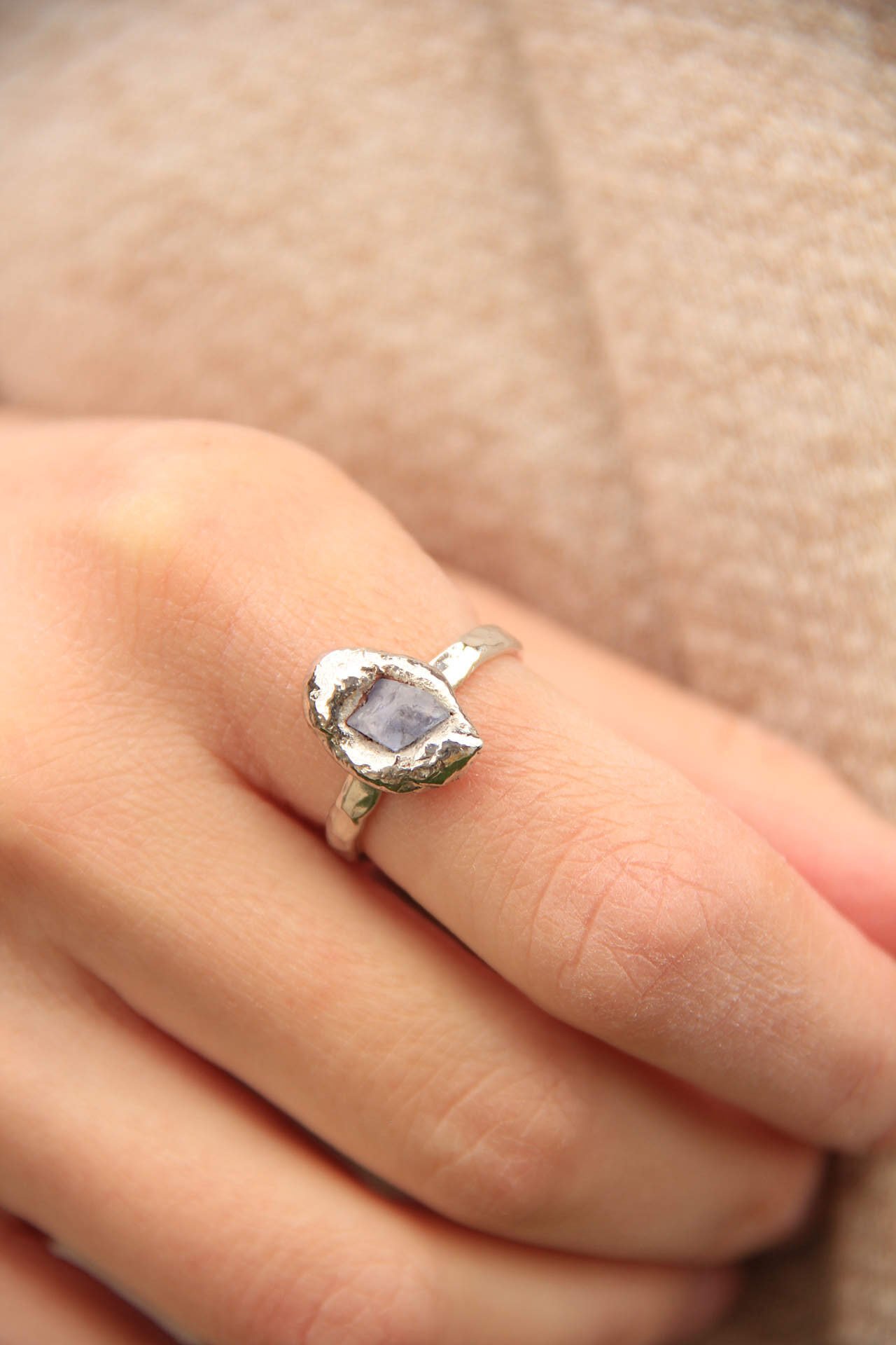 Elegantni prsten izrađen od srebra 925 sa velikim sirovim plavim safirom ljevanjem metala na kamen.