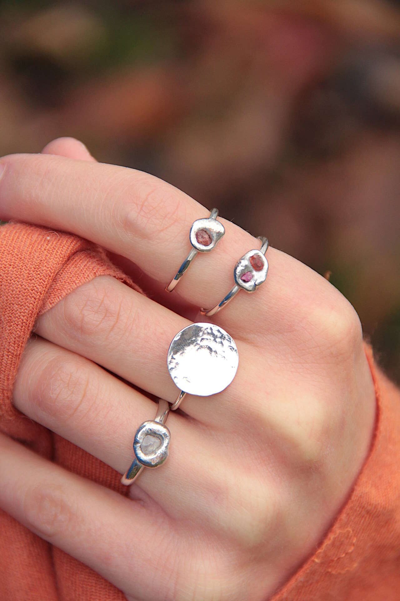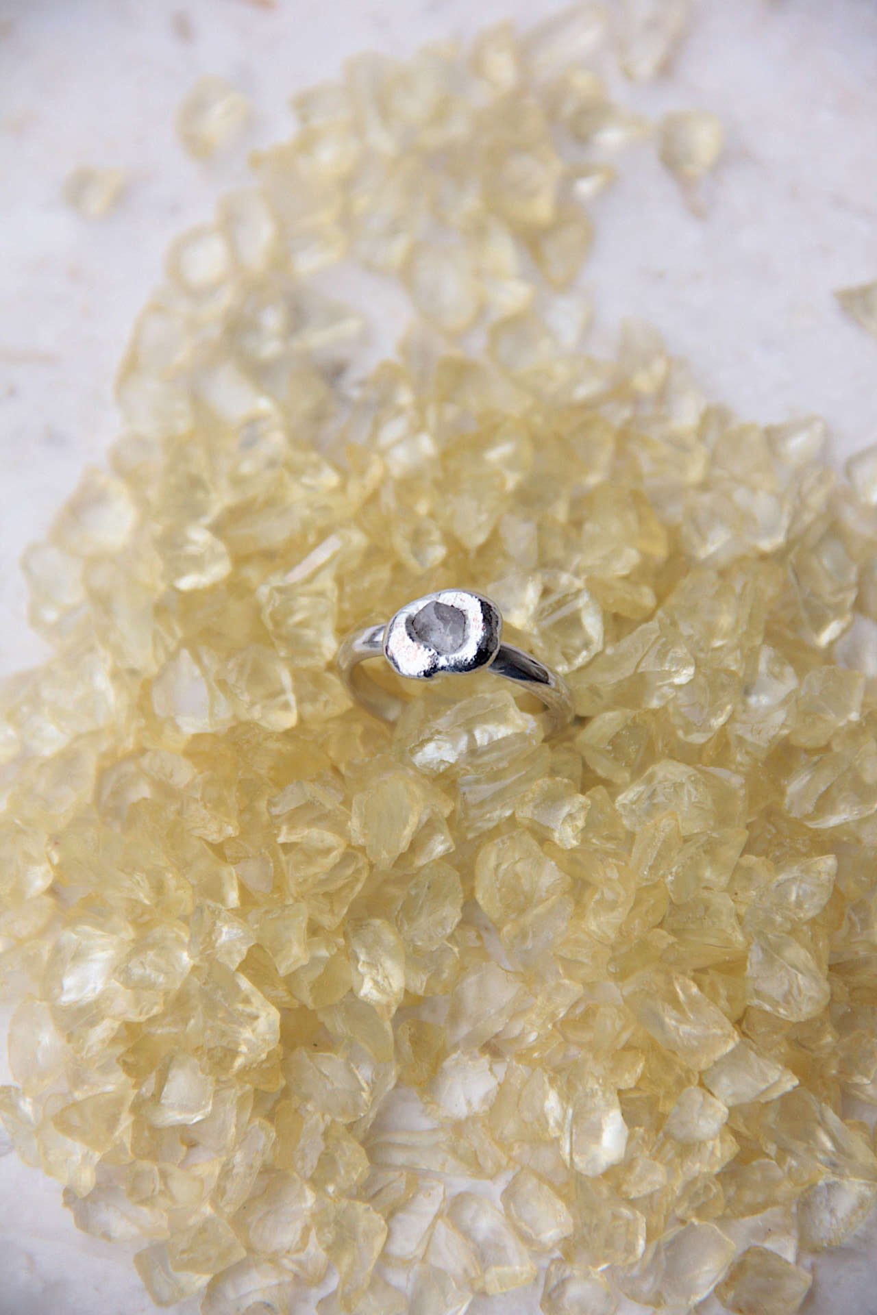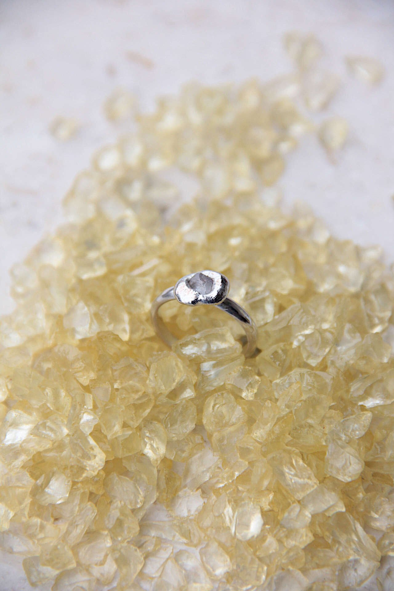 Mali elegantni prsten izrađen od srebra 925 sa sirovim/raw safirom kristalne ledene teksture setiranim ljevanjem metala na kamen.