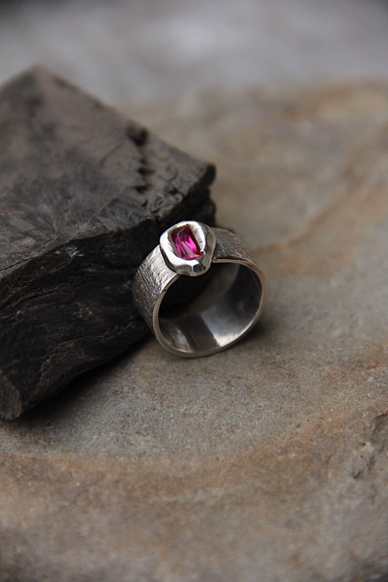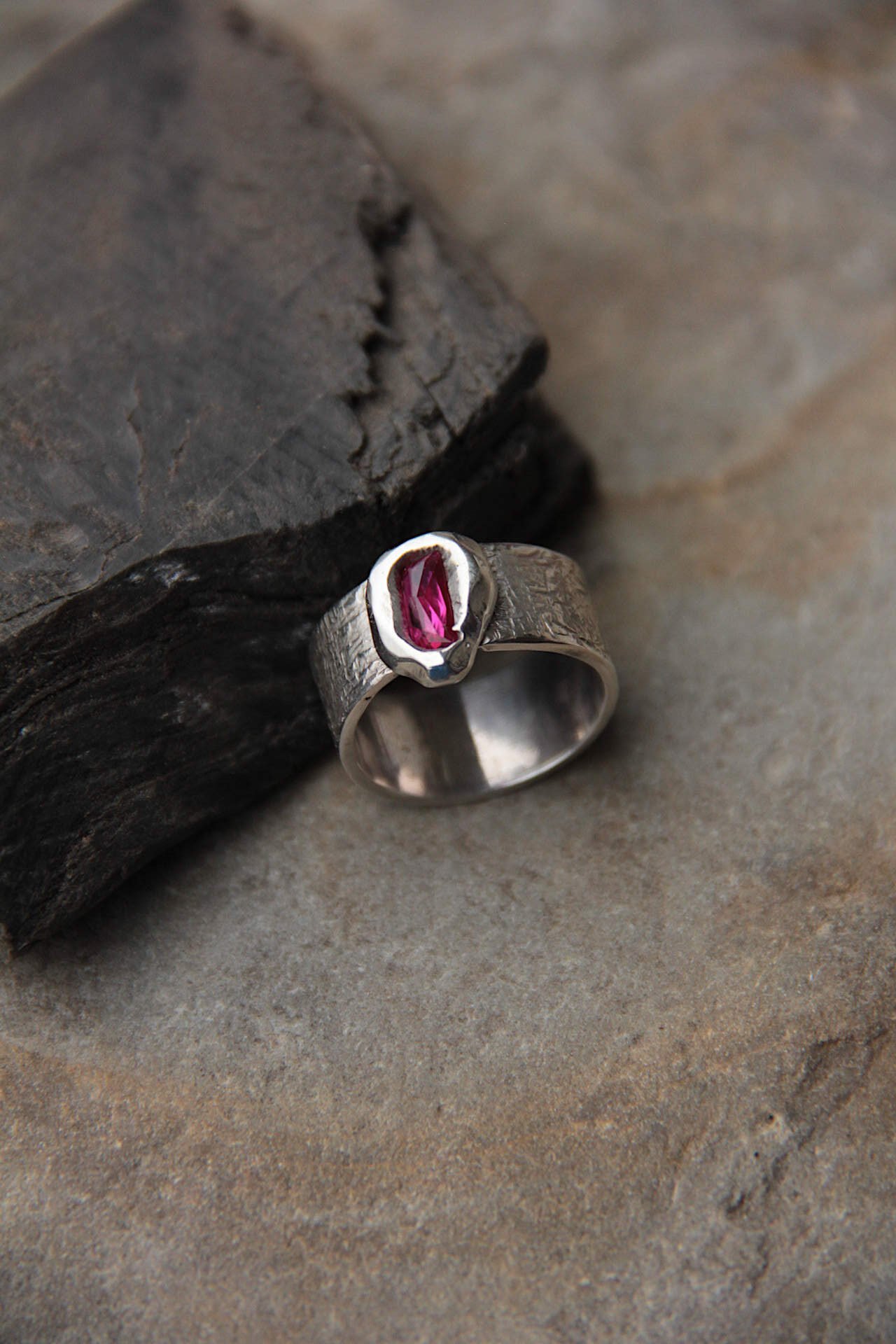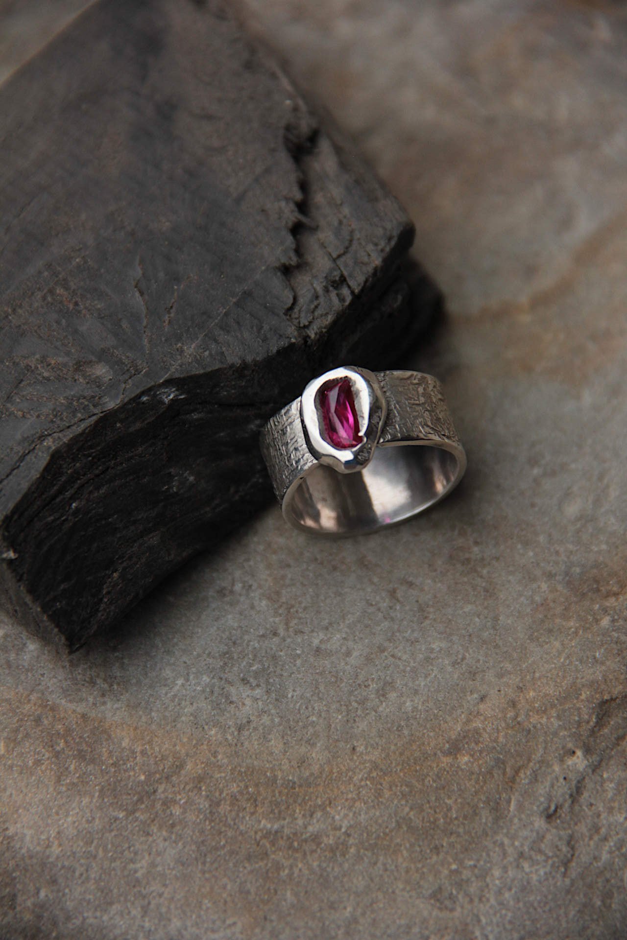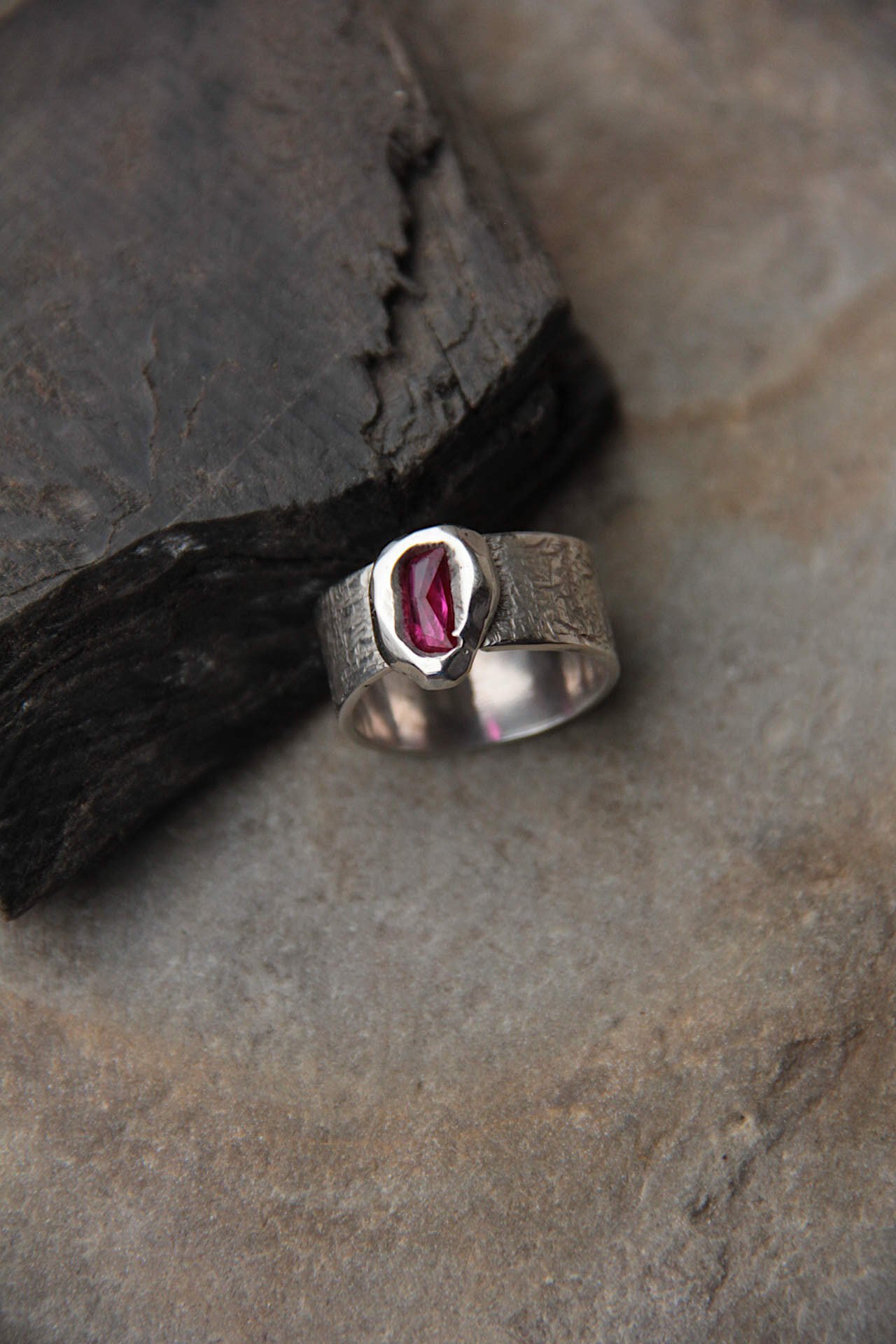 Prsten sa brušenim rubinom setiranim ljevanjem tekućeg srebra na kamen kojeg krasi ornamentni cuff.
